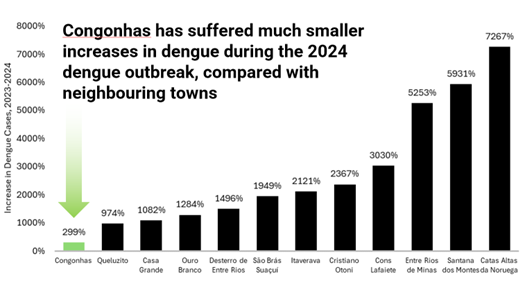 In 2024, while surrounding cities experienced up to a 7,000% increase in dengue cases compared to previous years, Congonhas reported a comparatively lower increase of 299%.